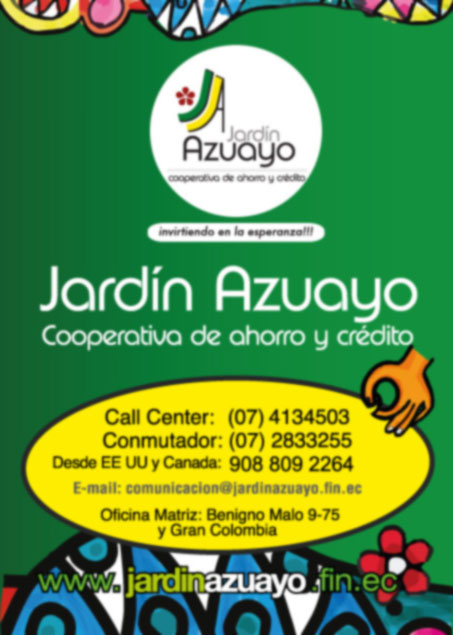 To register at Jardín Azuayo Móvil it is necessary to have contracted the Transactional Web service. Importante Para mayor información comuníquese a nuestro Call Center 07 45. Cooperativa De Ahorro Y Crédito Jardín Azuayo CALL CENTER - Call Center - teléfonos página web dirección y horarios de atención - Call Center - Cuenca.
