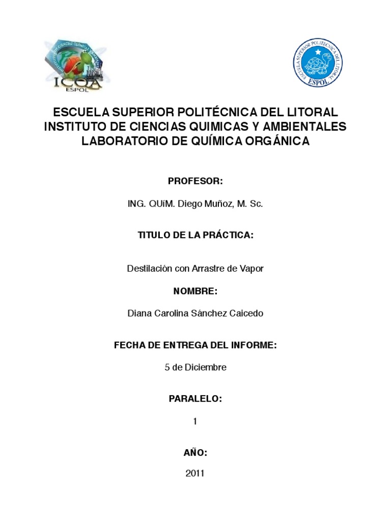 Informe De Laboratorio De Quimica Organica Destilacion Con Arrastre De Vapor Espol Destilacion Quimica